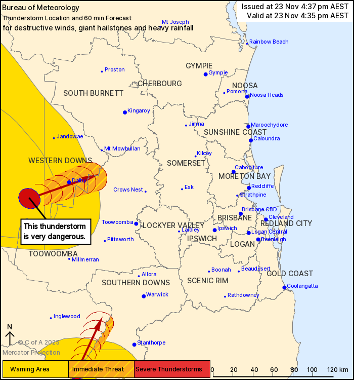 the east. The severe thunderstorm is forecast to affect Dalby, the