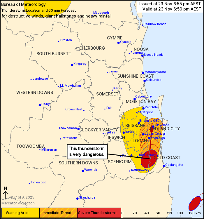 The Bureau of Meteorology warns that, at 6:50 pm, a VERY DANGEROUS THUNDERSTORM likely to produce damaging, locally destructive winds, large, possibly giant hailstones and heavy rainfall that may lead to flash flooding was detected near Numinbah Valley, Canungra and Mount Tamborine. This thunderstorm is moving towards the north. It is forecast to affect Beenleigh, Tamborine and Coomera by 7:20 pm and Logan Central, Cleveland and Russell Island by 7:50 pm.