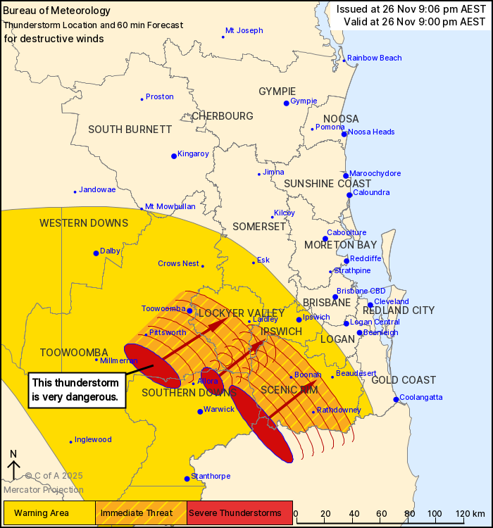 TOWARDS TOOWOOMBA, LOCALLY DESTRUCTIVE WINDS POSSIBLE.