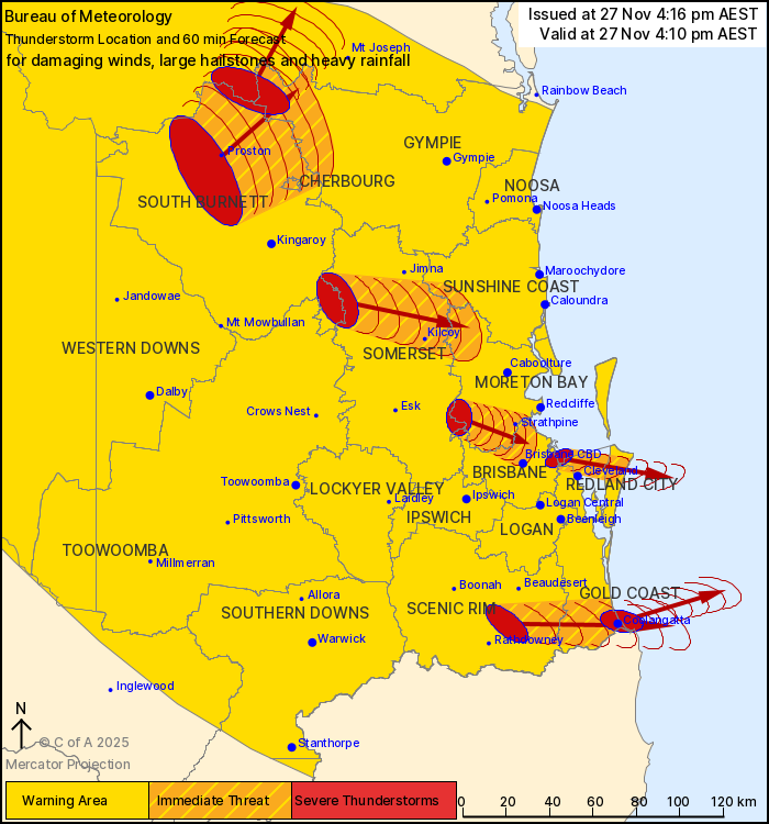 The Bureau of Meteorology warns that, at 4:10 pm, severe thunderstorms likely to produce damaging winds, large hailstones and heavy rainfall that may lead to flash flooding were detected near Coolangatta, Proston, the D'Aguilar Ranges, Wynnum, Laravale and the ranges south of Gayndah. These thunderstorms are moving towards the east to northeast. They are forecast to affect the area west of Kilcoy, Numinbah Valley and Little Nerang Dam by 4:40 pm and Brisbane CBD, Strathpine and Kilcoy by 5:10 pm.