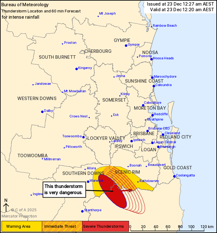 The Bureau of Meteorology warns that, at 12:20 am, a VERY DANGEROUS THUNDERSTORM likely to produce heavy, locally intense rainfall that may lead to dangerous and life-threatening flash flooding was detected near Killarney and Oakington. This thunderstorm is moving towards the east. It is forecast to affect Mount Barney and the area south of Cunninghams Gap by 12:50 am and Border Ranges National Park, Maroon Dam and Moogerah by 1:20 am.