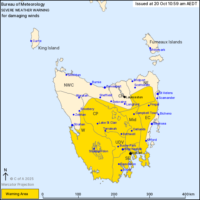 For the REMAINDER including Hobart: DAMAGING WESTERLY WINDS averaging 55 to 65 km/h with peak gusts around 100 km/h are possible, becoming likely during the afternoon.