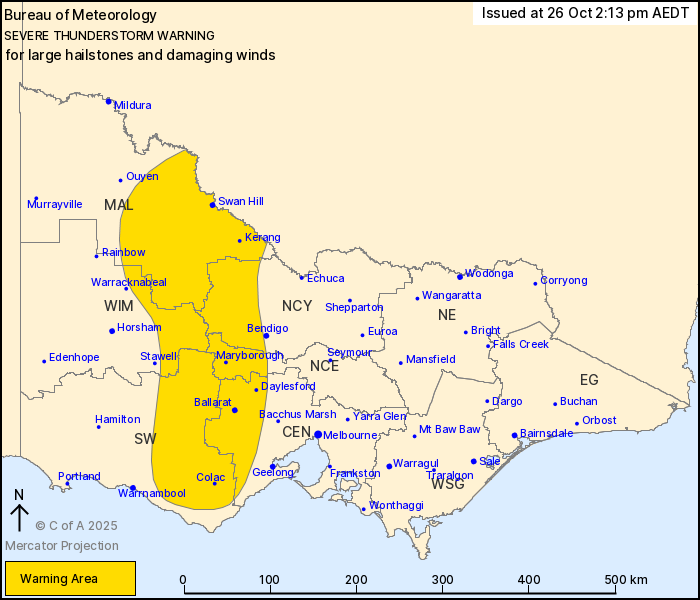 Severe thunderstorms are likely to produce large hailstones and damaging winds in the warning area over the next several hours. Locations which may be affected include Maryborough, Ballarat, Swan Hill, Kerang, Daylesford and Colac.