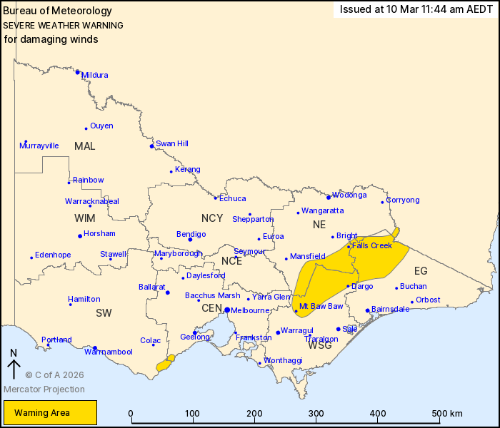 Locations which may be affected include Falls Creek, Mt Baw Baw,