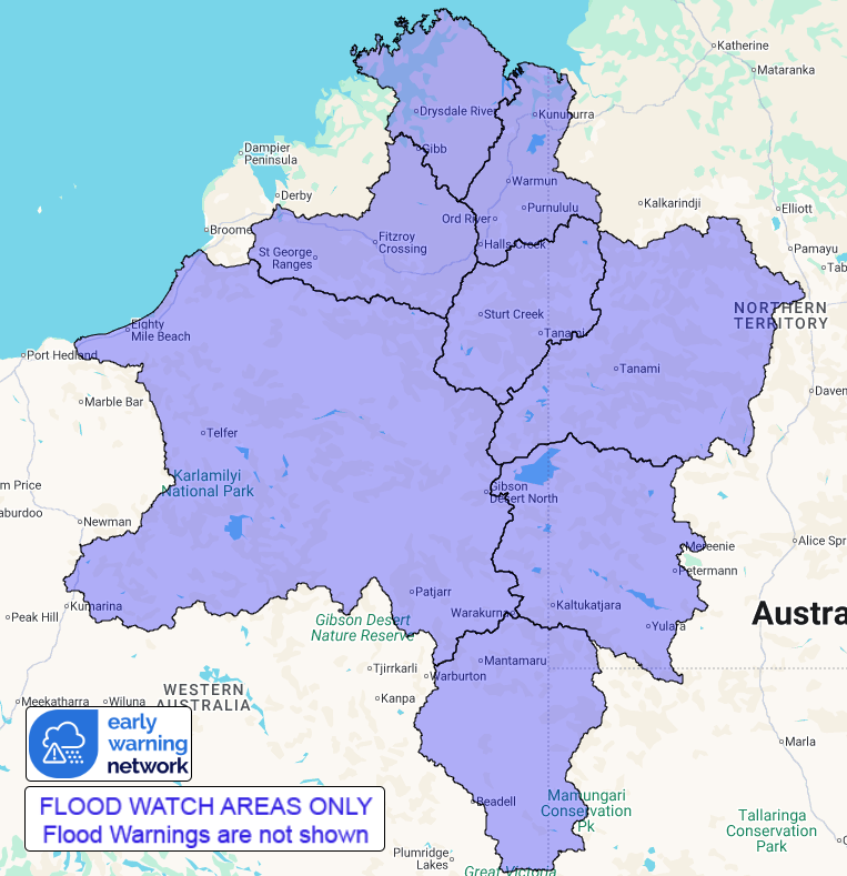 Kimberley and Fitzroy catchments from Saturday, extending to parts of the