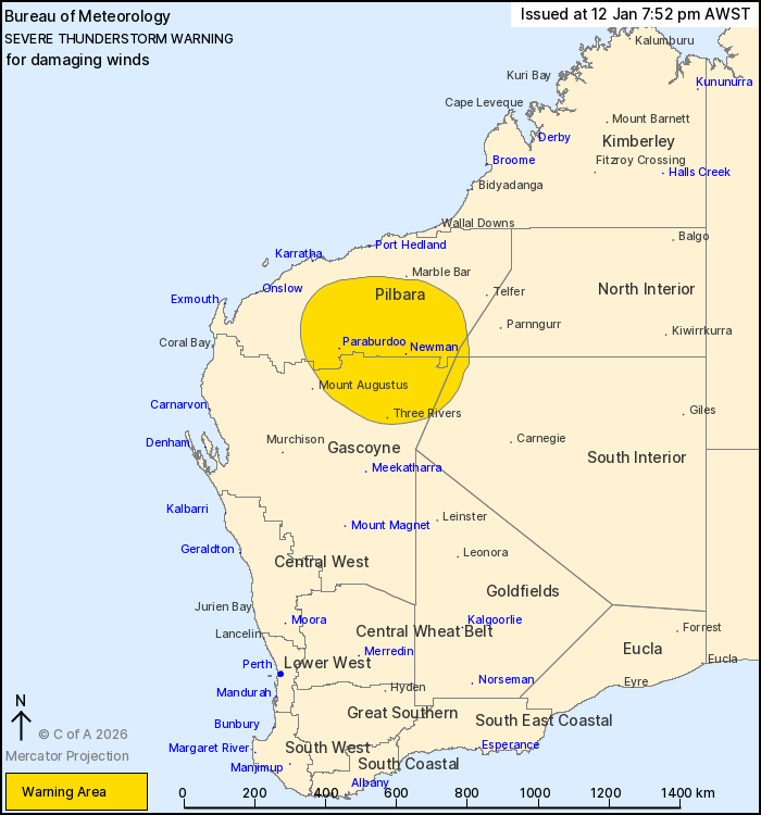 Severe thunderstorms are likely to produce damaging winds in the warning area over the next several hours. Locations which may be affected include Newman, Paraburdoo, Tom Price, Three Rivers, Nullagine and Jigalong.