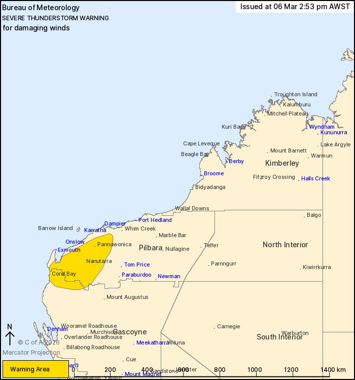 Severe thunderstorms are likely to produce damaging winds in the warning area over the next several hours. Locations which may be affected include Coral Bay, Nanutarra, Pannawonica and Millstream.