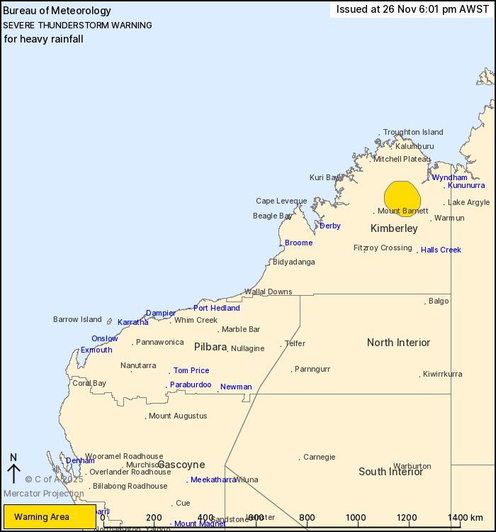 Weather Situation: The remnant circulation from ex-Tropical Cyclone Fina is generating a cluster of nearly stationary storms between Wyndham and Mount Barnett in the northern Kimberley. Given the very high moisture content of the atmosphere in this region, heavy rainfall is likely.