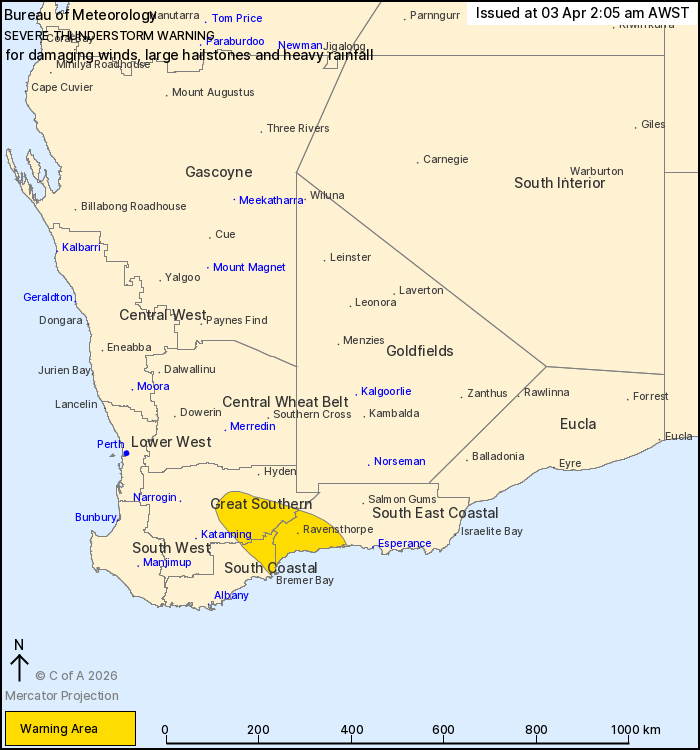 Severe thunderstorms are likely to produce damaging winds, large hailstones and heavy rainfall that may lead to flash flooding in the warning area over the next several hours. Locations which may be affected include Bremer Bay, Ravensthorpe, Hopetoun, Jerramungup, Lake Grace and Lake King.
