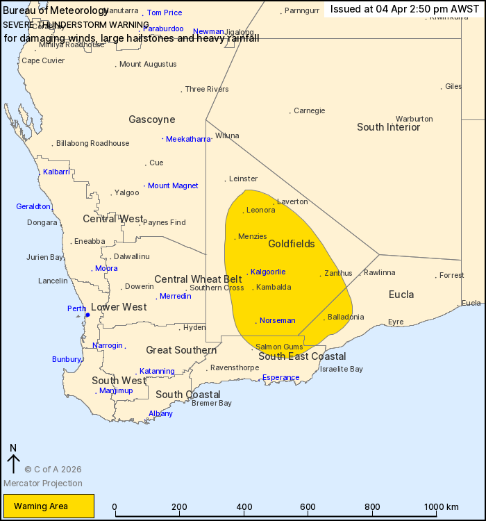 Severe thunderstorms are likely to produce damaging winds, large hailstones and heavy rainfall that may lead to flash flooding in the warning area over the next several hours. Locations which may be affected include Kalgoorlie, Norseman, Balladonia, Laverton, Leonora and Menzies.