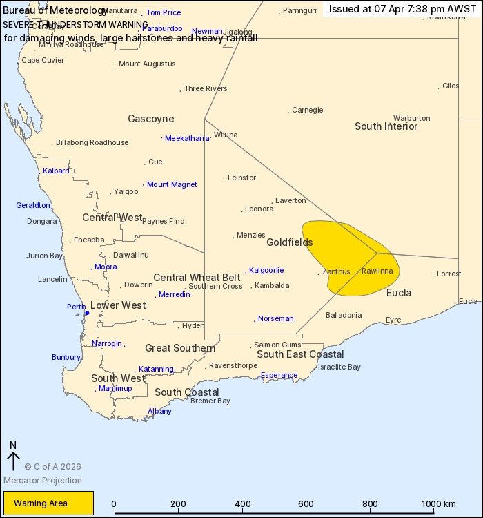 Severe thunderstorms over parts of the Goldfields and Eucla.
