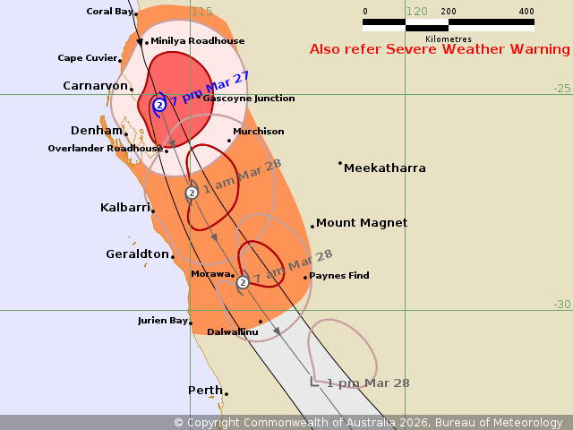 DESTRUCTIVE WIND GUSTS in excess of 125 km/h extend from Minilya Roadhouse to Overlander Roadhouse and inland to Gascoyne Junction. DESTRUCTIVE WIND GUSTS in excess of 125 km/h are expected to extend south and may reach inland parts of the Central West and adjacent western Gascoyne overnight, and possibly as far south as Morawa early Saturday morning.