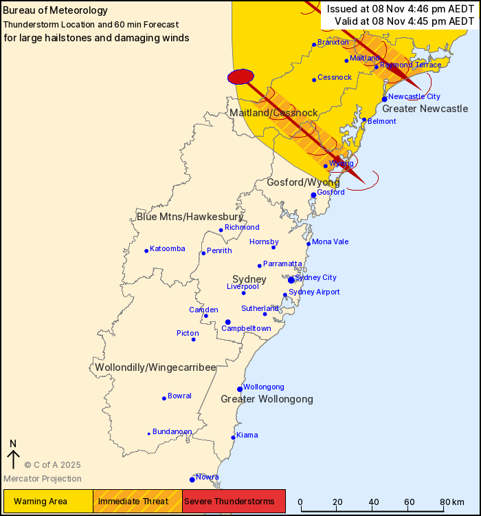 pm and Wyong, Raymond Terrace and Budgewoi by 5:45 pm.