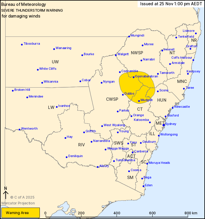 Severe thunderstorms are likely to produce damaging winds in the warning area over the next several hours. Locations which may be affected include Mudgee, Coonabarabran, Merriwa, Gulgong, Mullaley and Tambar Springs.