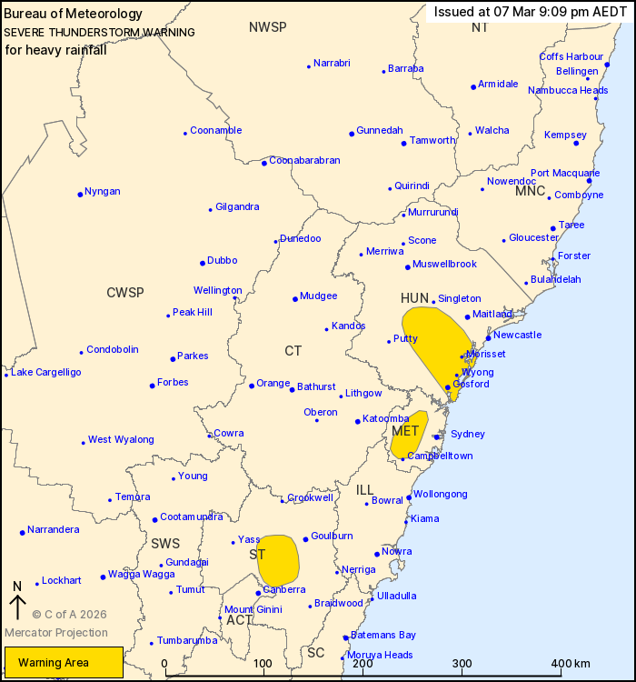 thunderstorms with heavy rainfall over parts of the ACT and central