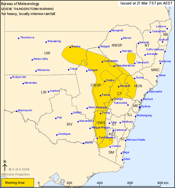 Severe thunderstorms are likely to produce heavy rainfall that may lead to flash flooding over the next several hours in the South West Slopes and parts of the Hunter, Central Tablelands, Southern Tablelands, North West Slopes and Plains, Central West Slopes and Plains, Upper Western, Snowy Mountains, Australian Capital Territory and Riverina districts. Locations which may be affected include Orange, Dubbo, Bourke, Mudgee, Parkes and Coonabarabran.