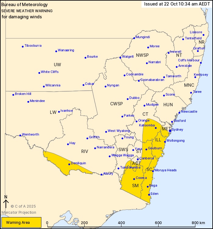 For the CENTRAL RANGES, COASTAL PARTS of the ILLAWARRA and southern parts of the RIVERINA: DAMAGING WINDS averaging 55 to 65 km/h with gusts around 90 km/h are possible, with gusts around 100 km/h likely during the afternoon.