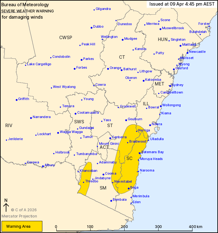 For the SOUTH COAST: DAMAGING WIND GUSTS with peak gusts of around 90 km/h are possible from Bega to Ulladulla during Friday morning.