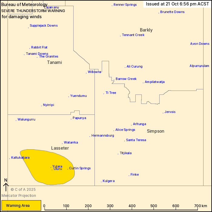 Severe thunderstorms are likely to produce damaging wind gusts in the warning area over the next several hours. Locations which may be affected include Yulara, Curtin Springs and Uluru.