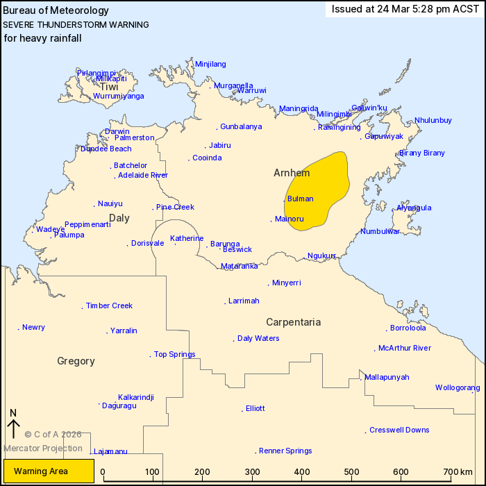 Severe thunderstorms are likely to produce heavy rainfall that may lead to flash flooding in the warning area over the next several hours. Locations which may be affected include Arnhem District south of Ramingining.