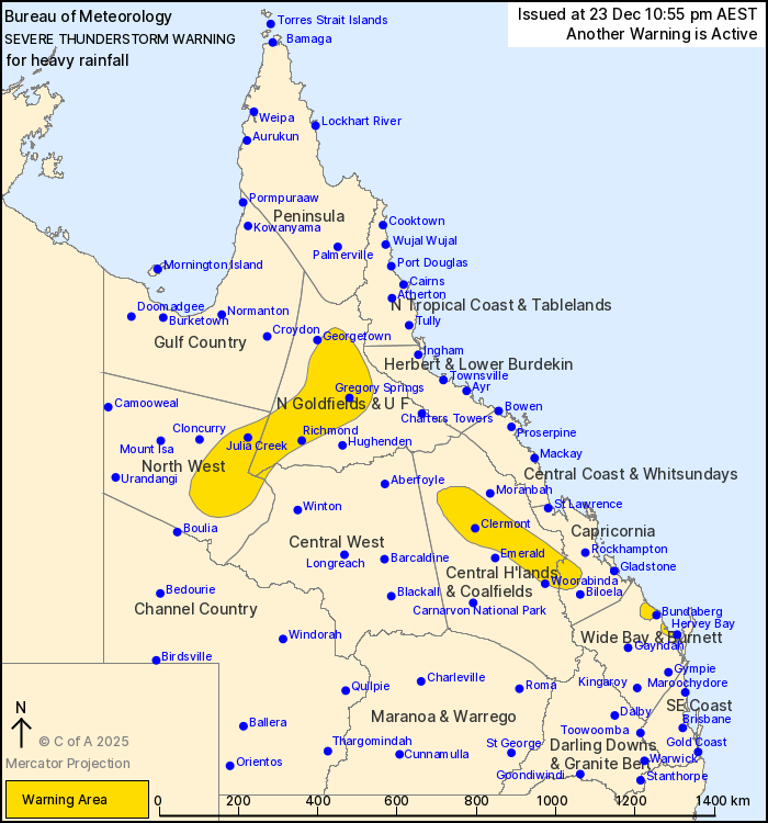 Severe thunderstorms are likely to produce heavy rainfall that may lead to flash flooding in the warning area over the next several hours. Locations which may be affected include Clermont, Richmond, Julia Creek, Woorabinda, Gregory Springs and Blackwater.