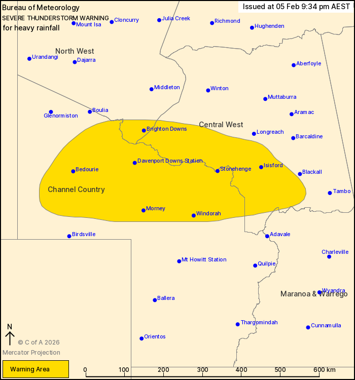 Severe thunderstorms are likely to produce heavy rainfall that may lead to flash flooding in the warning area over the next several hours. Locations which may be affected include Windorah, Isisford, Bedourie, Stonehenge, Davenport Downs Station and Morney.