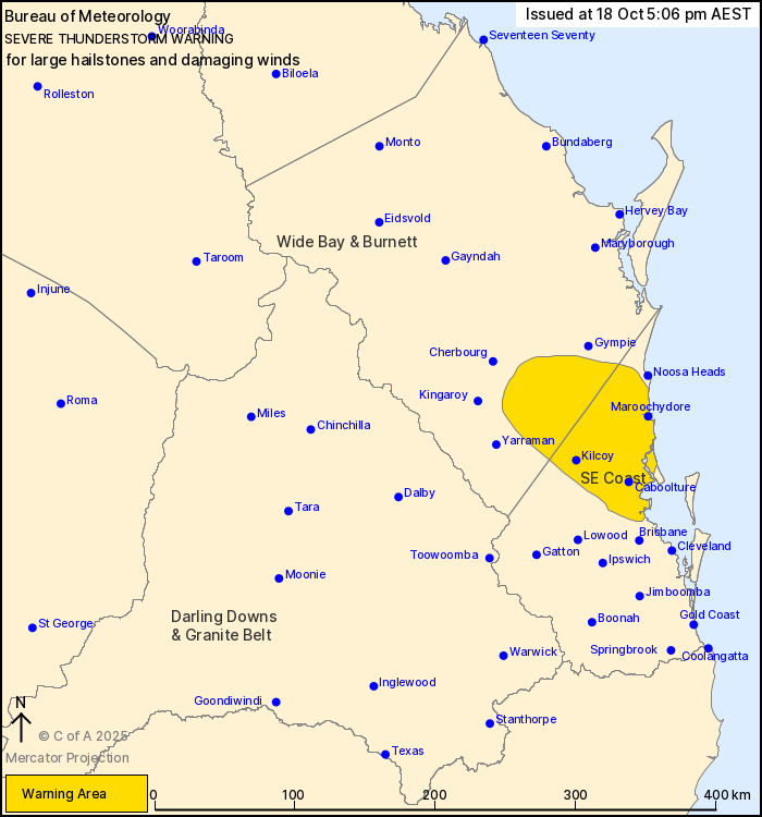 Severe thunderstorms are likely to produce large hailstones and damaging winds in the warning area over the next several hours. Locations which may be affected include Maroochydore, Caboolture, Kilcoy, Caloundra, Nambour, Woodford, Cooroy and Imbil.
