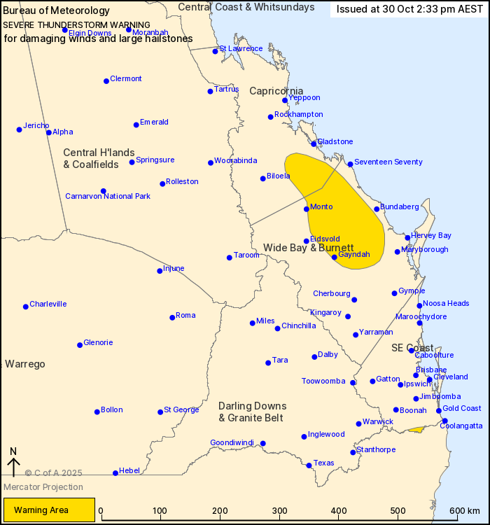 Locations which may be affected include Gayndah, Gin Gin, Miriam