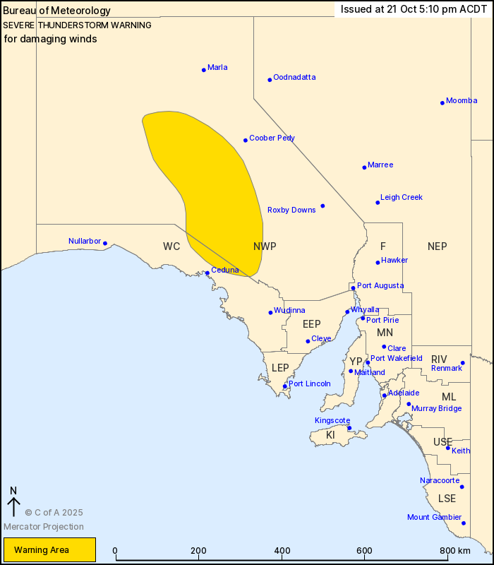 Severe thunderstorms are likely to produce damaging winds in the warning area over the next several hours. Locations which may be affected include Tarcoola and the area around Emu Junction.