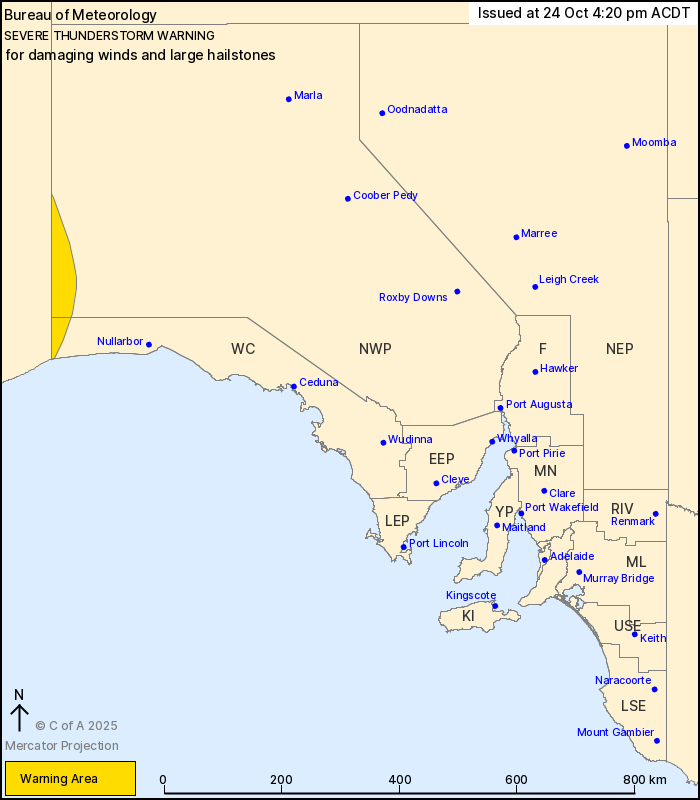 Weather situation: A trough and complex low pressure system are initiating severe thunderstorms about the far west of South Australia this afternoon. Thunderstorms are likely to persist into the evening.