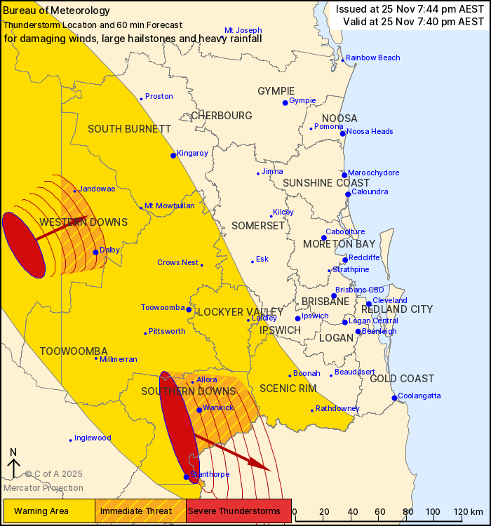 Allora and the area south of Warwick by 8:10 pm and Dalby, Jandowae