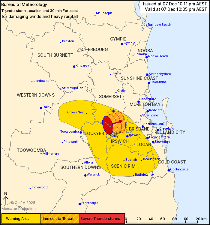 The Bureau of Meteorology warns that, at 10:05 pm, a severe thunderstorm likely to produce damaging winds and heavy rainfall that may lead to flash flooding was detected near the area south of Esk and Hatton Vale. This thunderstorm is moving towards the east. It is forecast to affect Lowood by 10:20 pm and Marburg, Fernvale and southern Lake Wivenhoe by 10:35 pm.