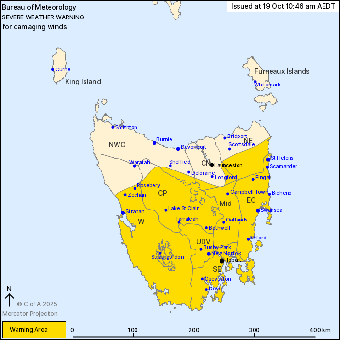 For ELEVATED TERRAIN and EXPOSED FAR SOUTHERN TASMANIA: DAMAGING