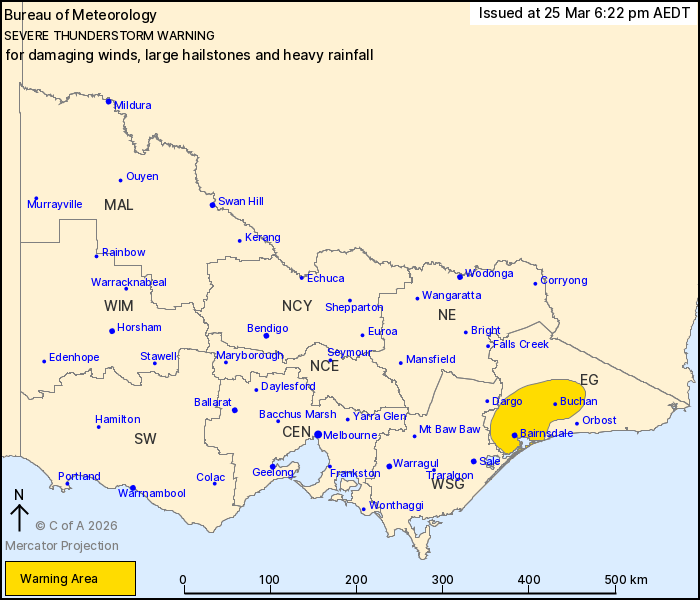 Severe thunderstorms are likely to produce damaging winds, large hailstones and heavy rainfall that may lead to flash flooding in the warning area over the next several hours. Locations which may be affected include Bairnsdale and Buchan.