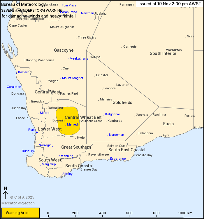 Severe thunderstorms are likely to produce damaging winds and heavy rainfall that may lead to flash flooding in the warning area over the next several hours. Locations which may be affected include Merredin, Southern Cross, Beacon, Bruce Rock, Kellerberrin and Mukinbudin.