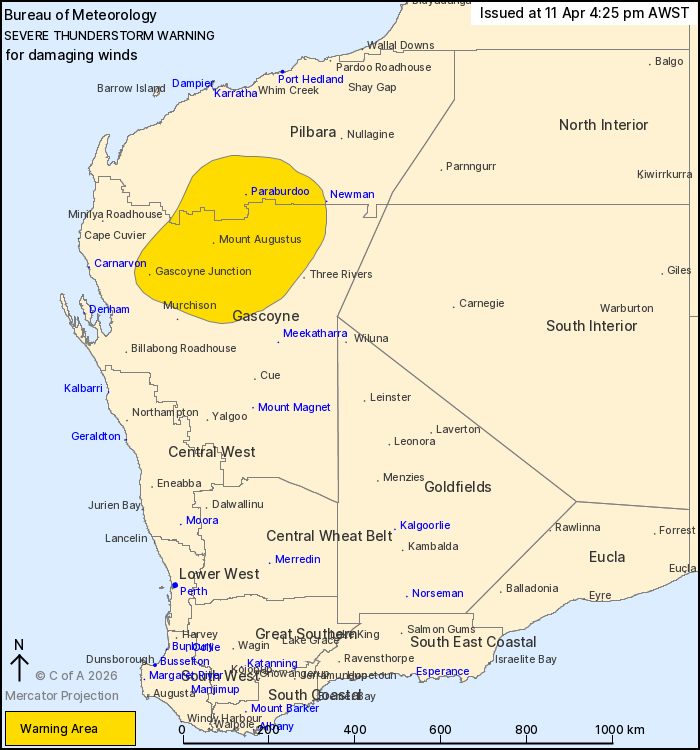 Severe thunderstorms are likely to produce damaging winds in the warning area over the next several hours. Locations which may be affected include Paraburdoo, Tom Price, Gascoyne Junction and Mount Augustus.