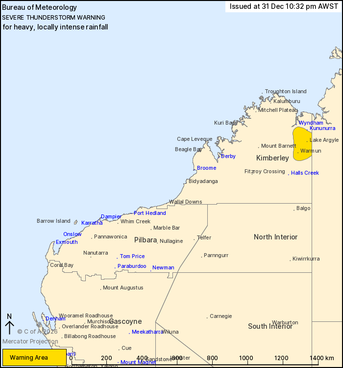 VERY DANGEROUS THUNDERSTORMS are likely to produce heavy, locally intense rainfall that may lead to flash flooding in the warning area over the next several hours. Locations which may be affected include Lake Argyle and Warmun.